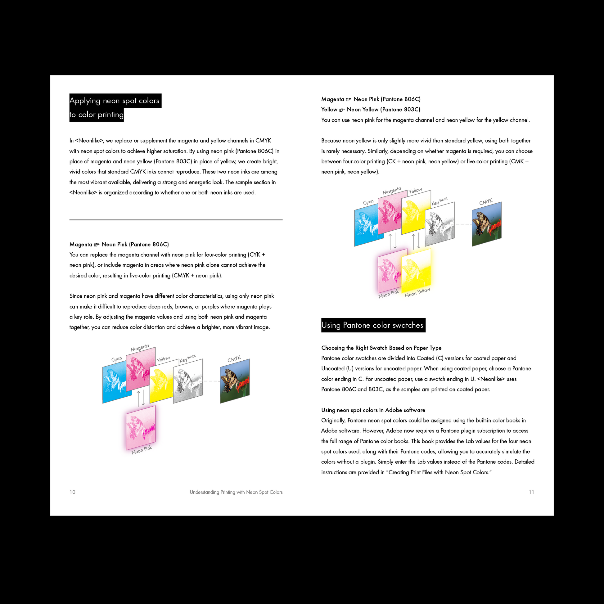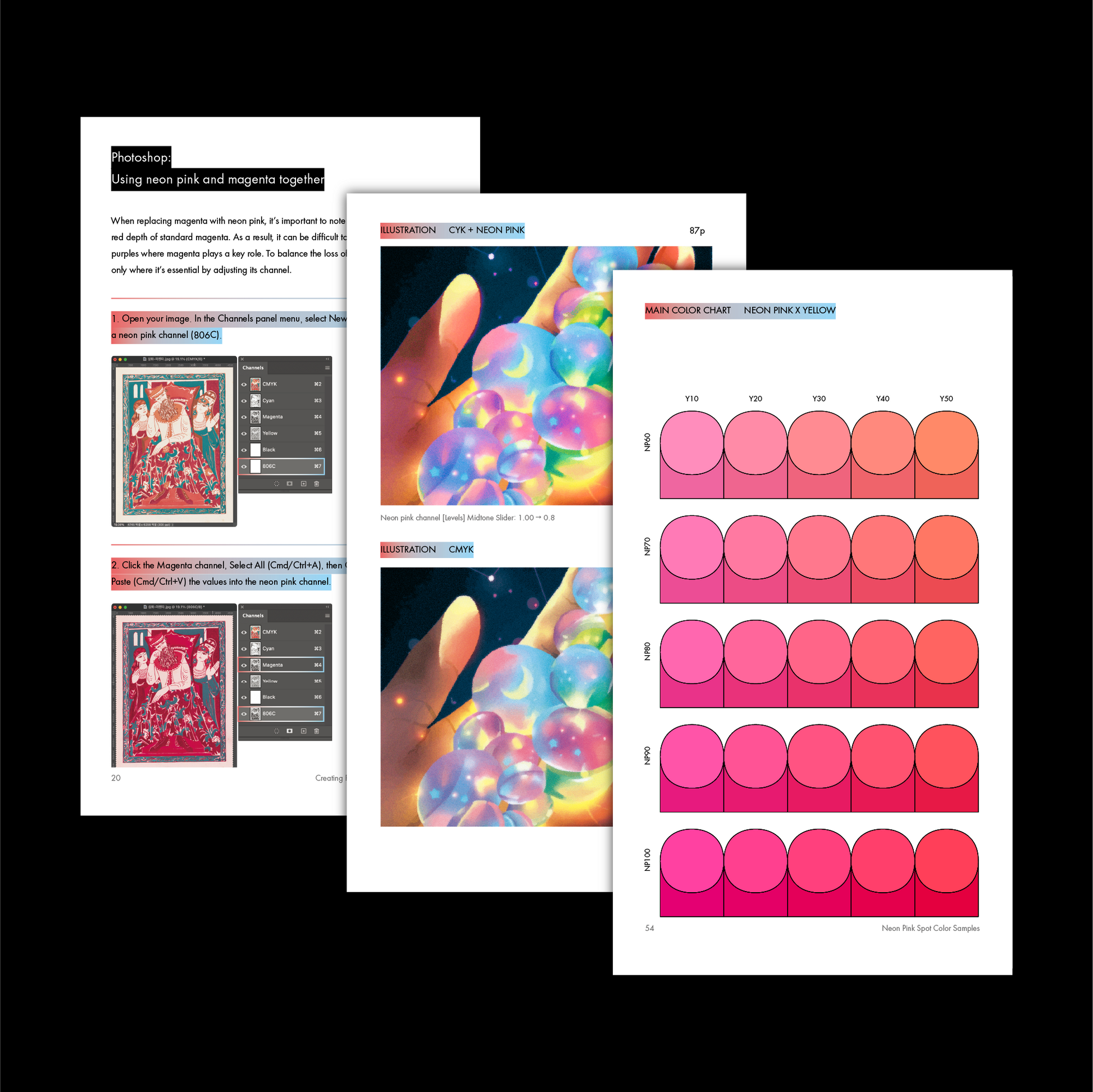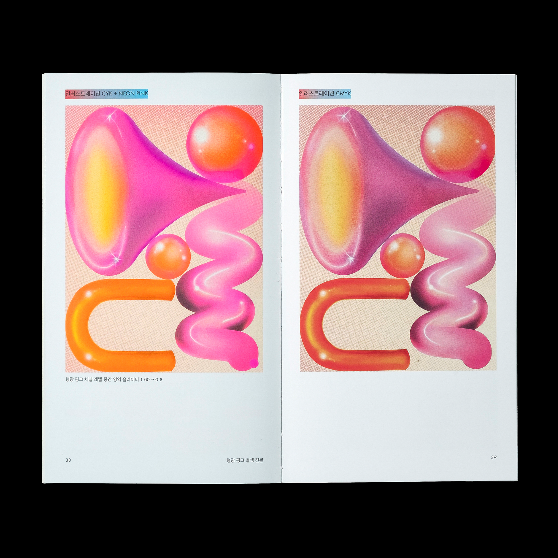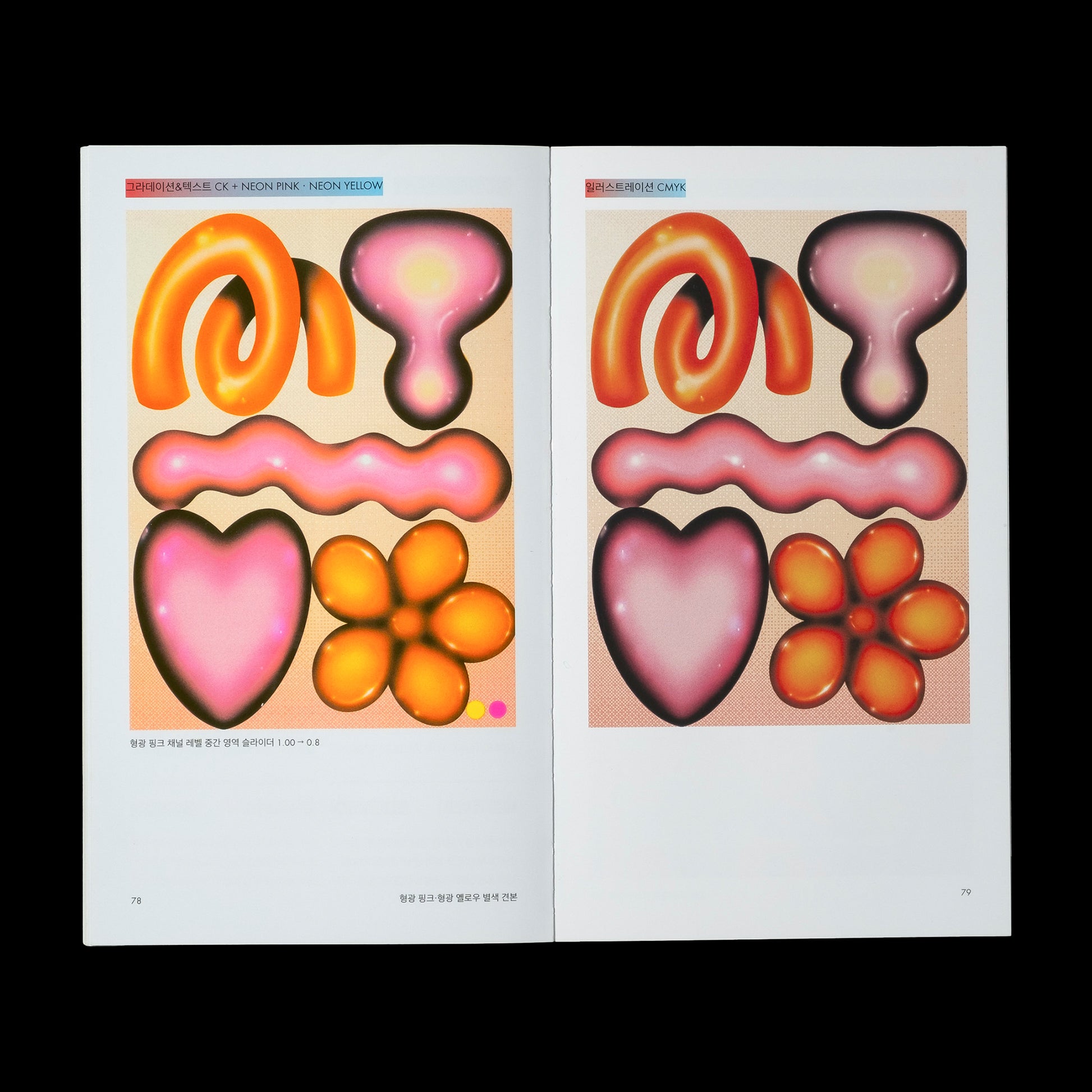En remplaçant les encres CMJN classiques par du rose fluorescent (Pantone 806C) et du jaune fluorescent (Pantone 803C), ce livre démontre comment obtenir des résultats d’impression bien plus percutants que les méthodes conventionnelles. Des couleurs autrefois considérées comme réservées à l’affichage RGB ou à l’impression risographique peuvent désormais être reproduites en offset, grâce aux encres fluorescentes.