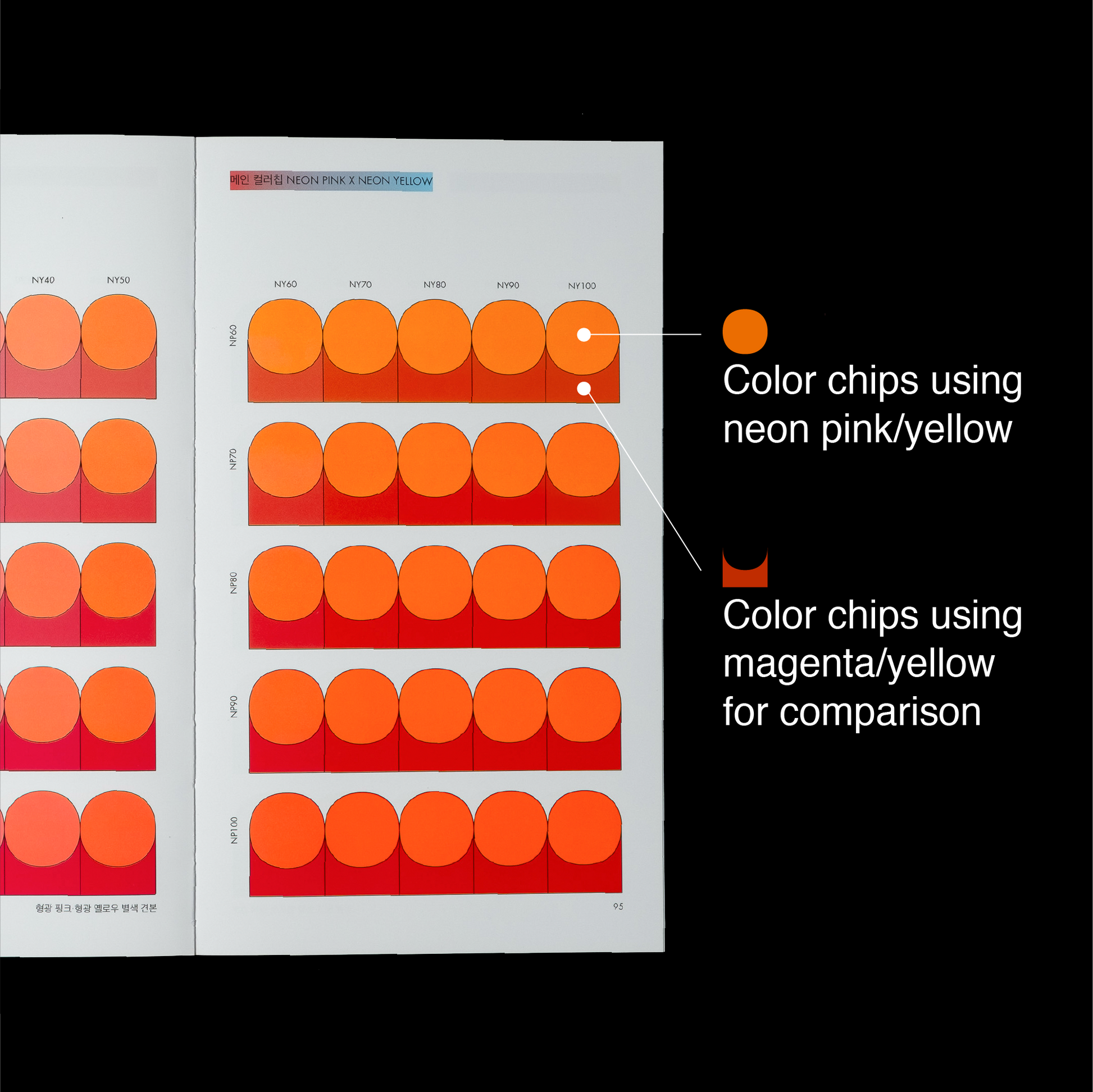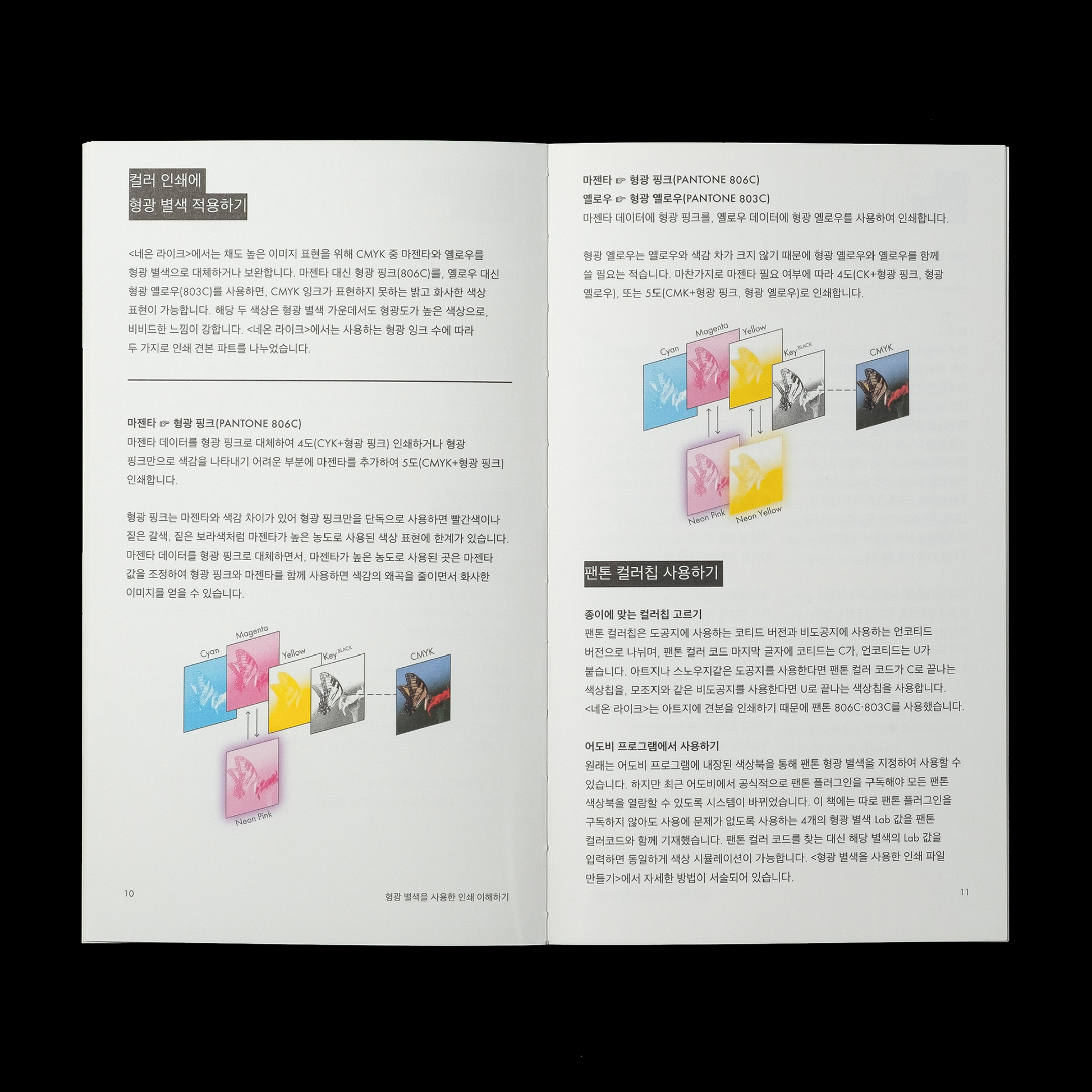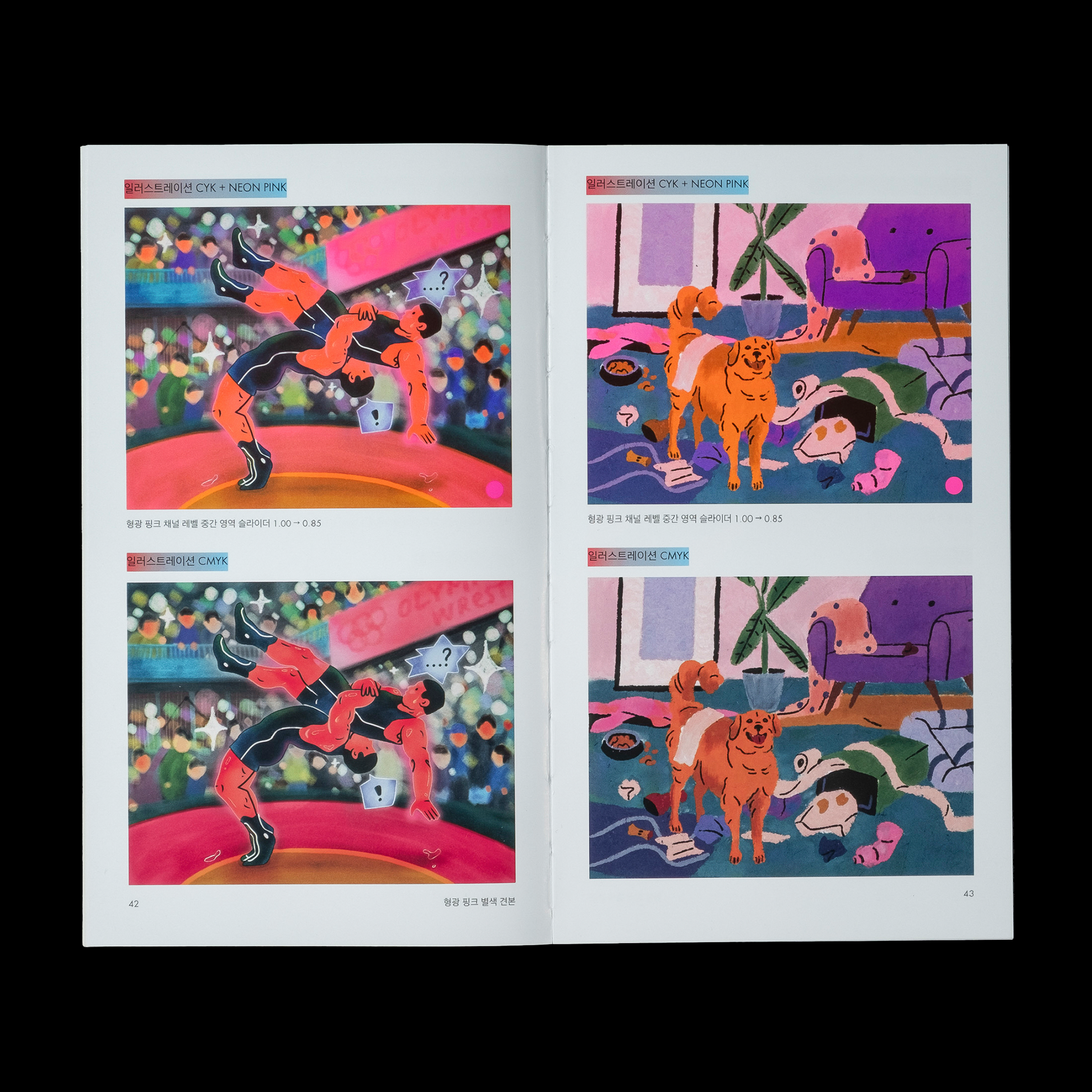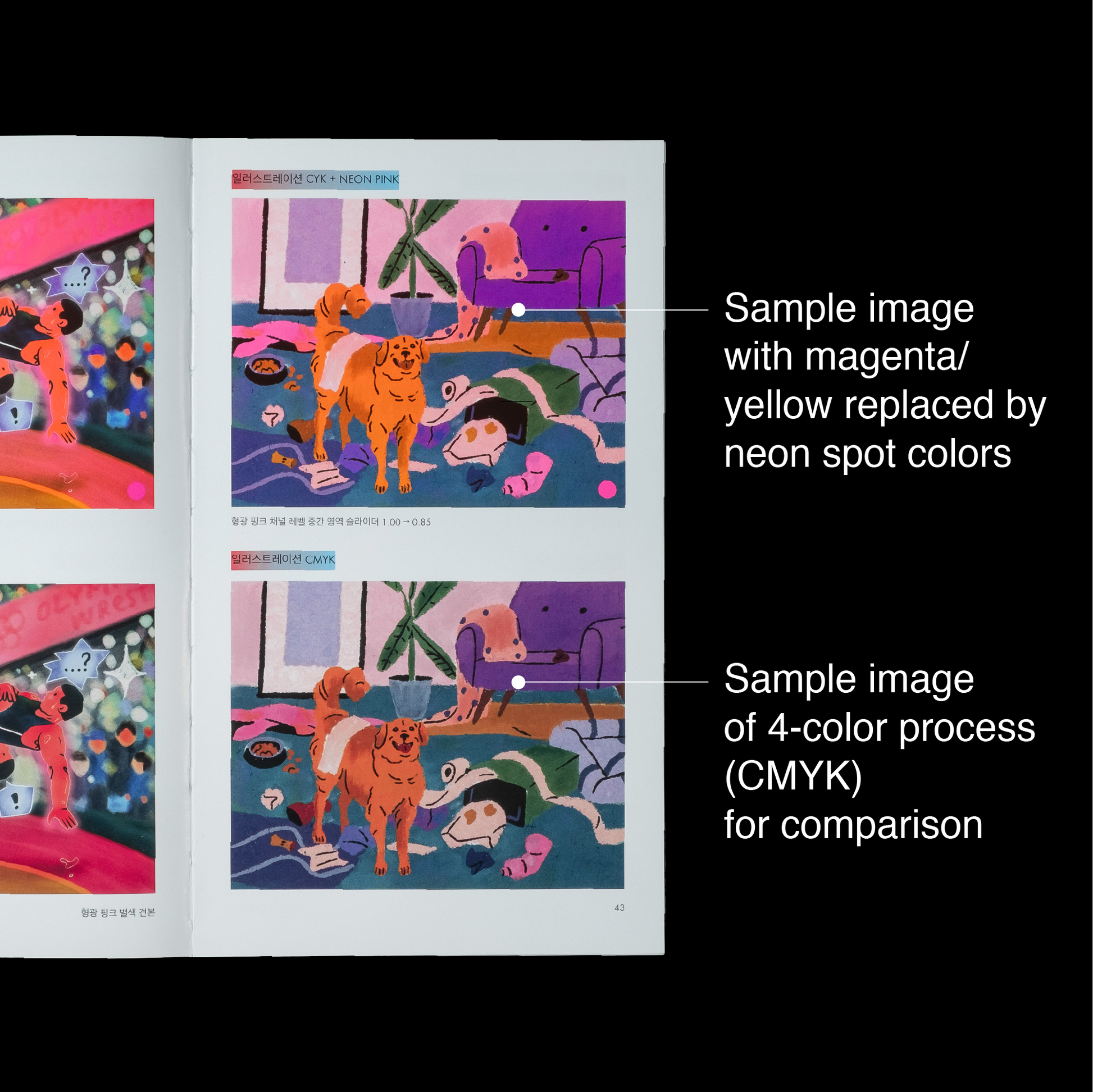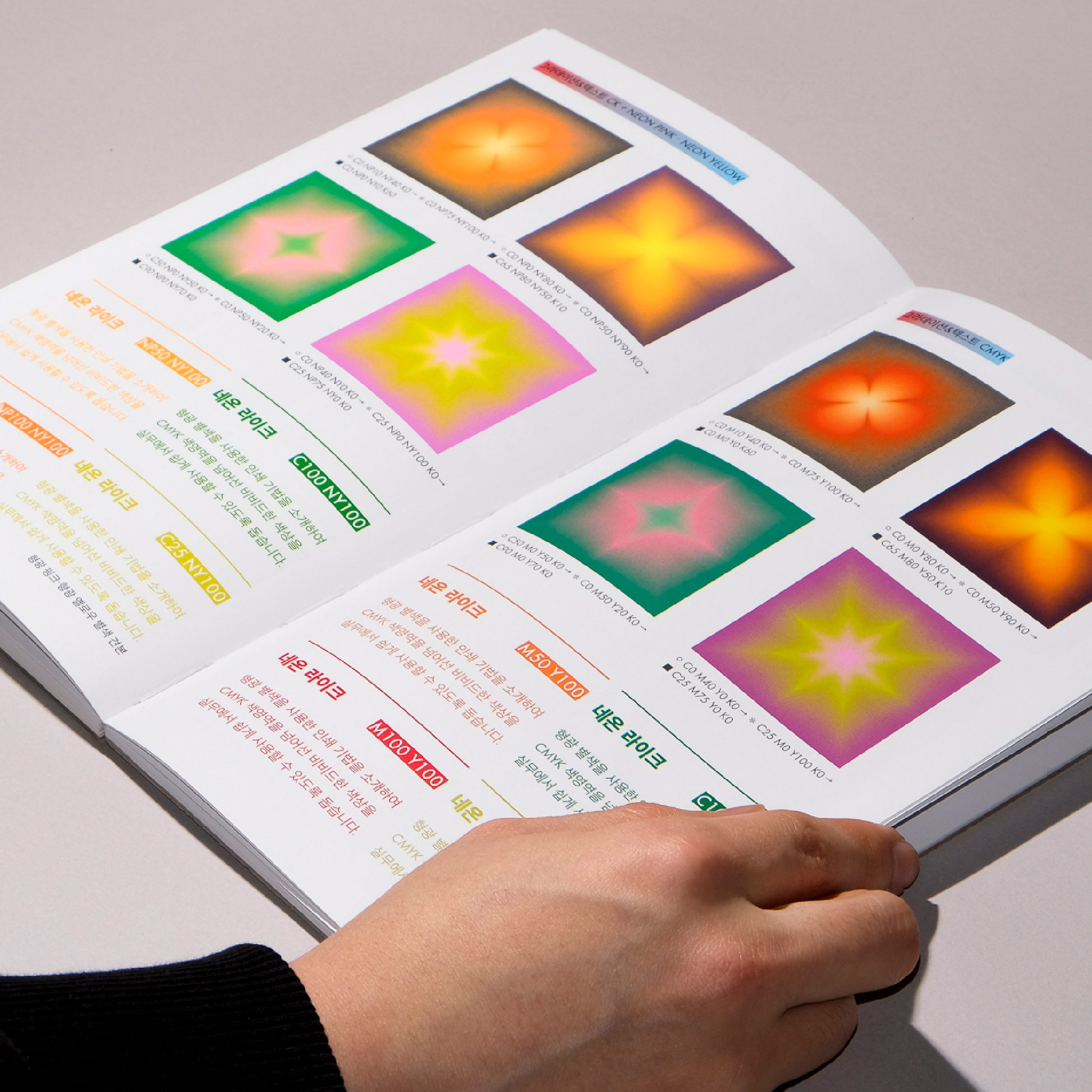 En remplaçant les encres CMJN classiques par du rose fluorescent (Pantone 806C) et du jaune fluorescent (Pantone 803C), ce livre démontre comment obtenir des résultats d’impression bien plus percutants que les méthodes conventionnelles. Des couleurs autrefois considérées comme réservées à l’affichage RGB ou à l’impression risographique peuvent désormais être reproduites en offset, grâce aux encres fluorescentes.