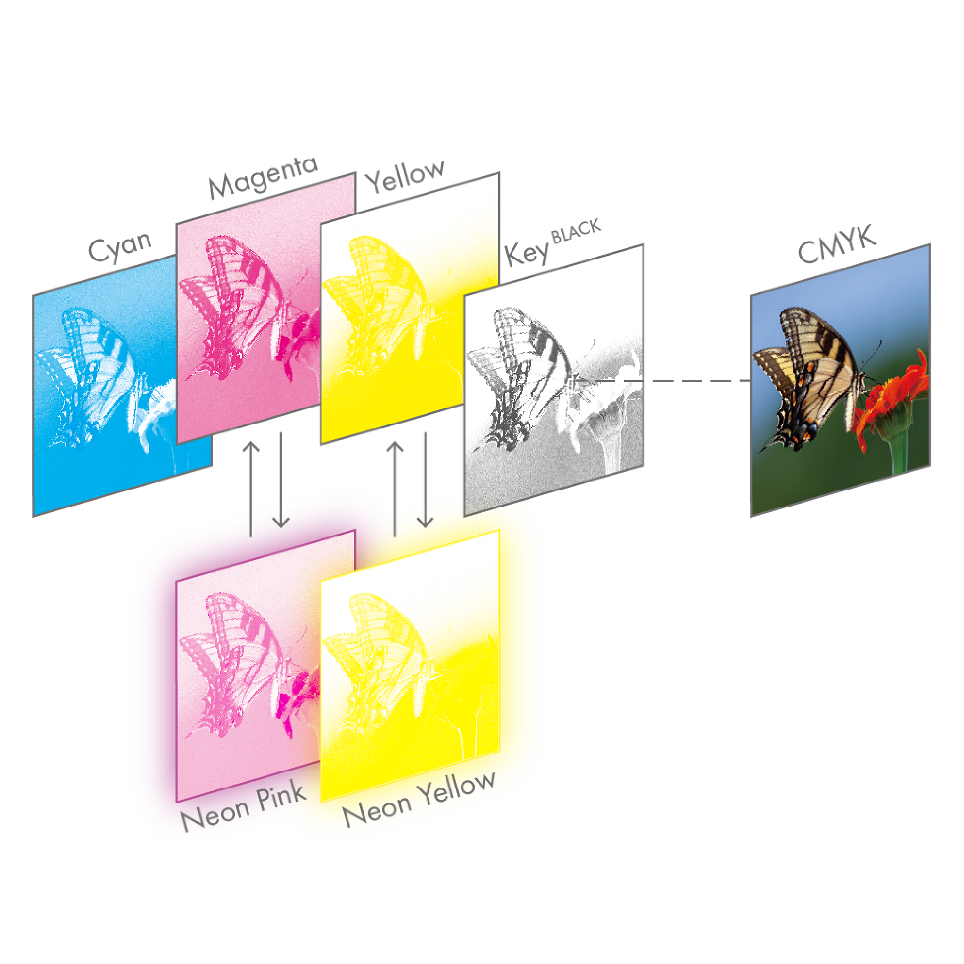 – Partie échantillons : des comparaisons côte à côte d’images et de couleurs imprimées en CMJN et en encres fluorescentes, pour que vous puissiez constater visuellement la différence.