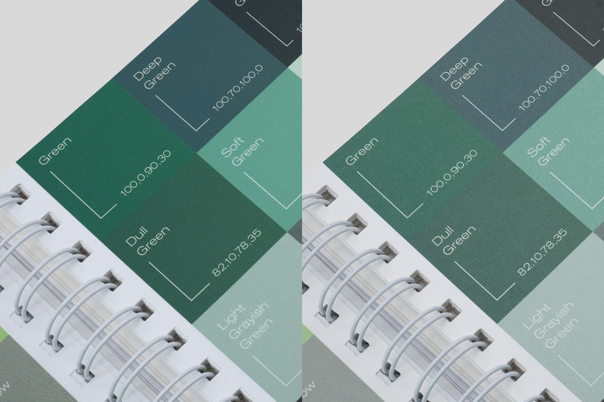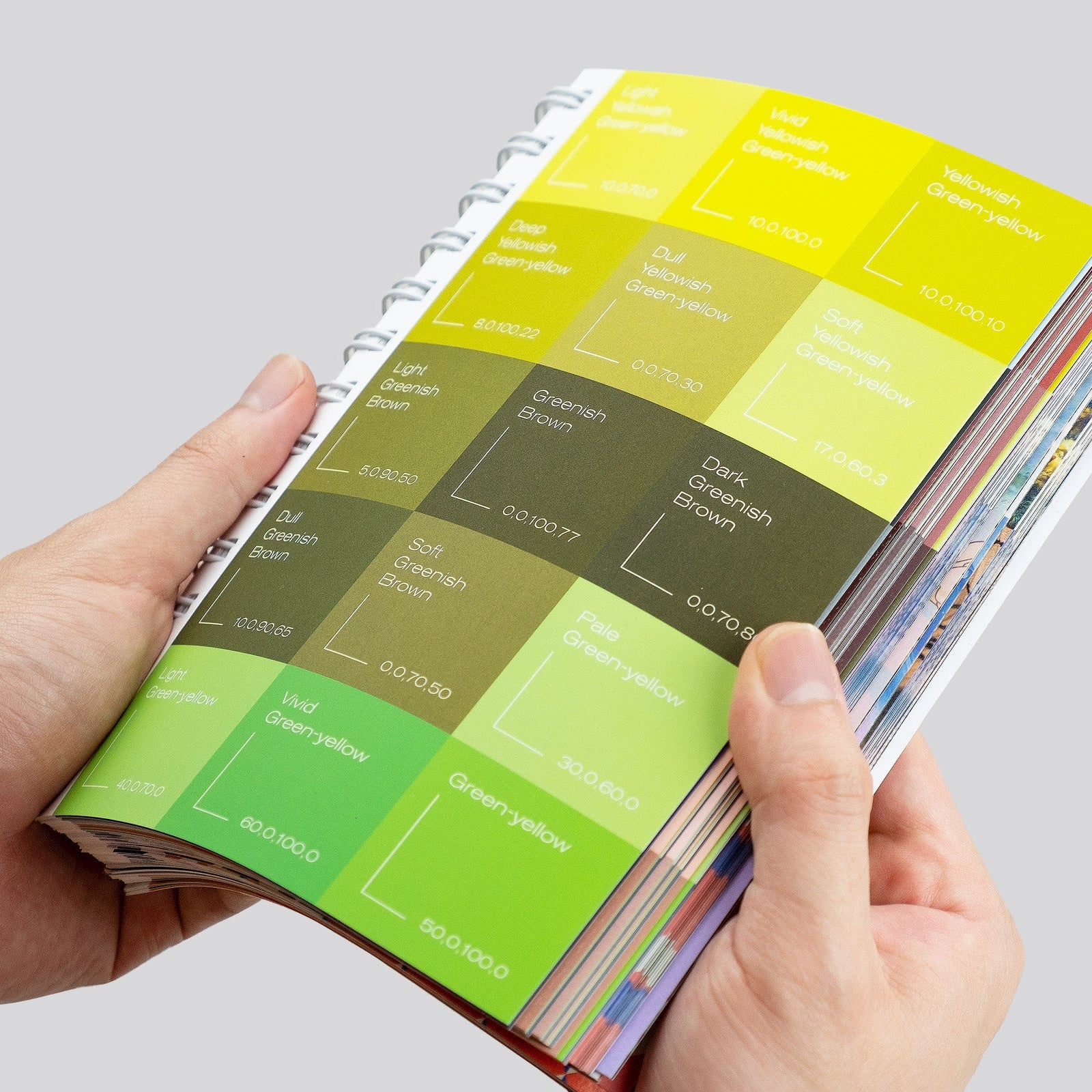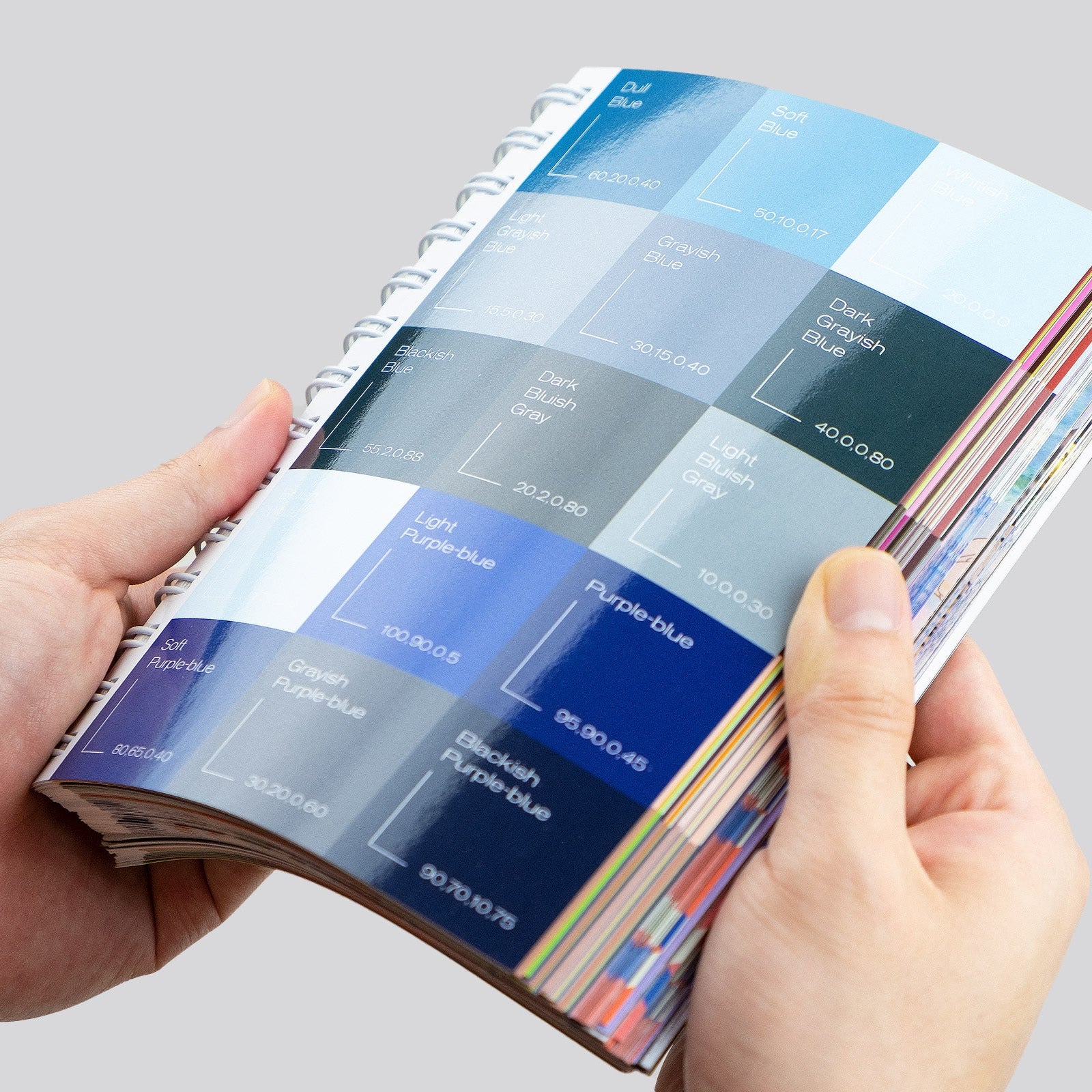 Standard Samples (8 types): A standard sample of papers frequently used in publishing. It contains basic gloss coated paper, matte coated paper, wood-free paper, and silk paper. For the matte coated paper, three additional laminations—matte, gloss, and velvet—are applied, allowing you to see how the lamination affects color and texture.