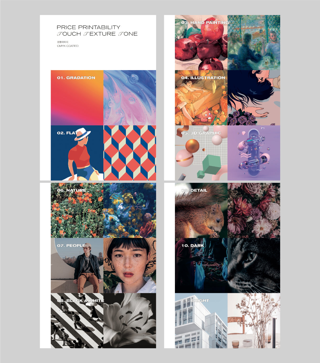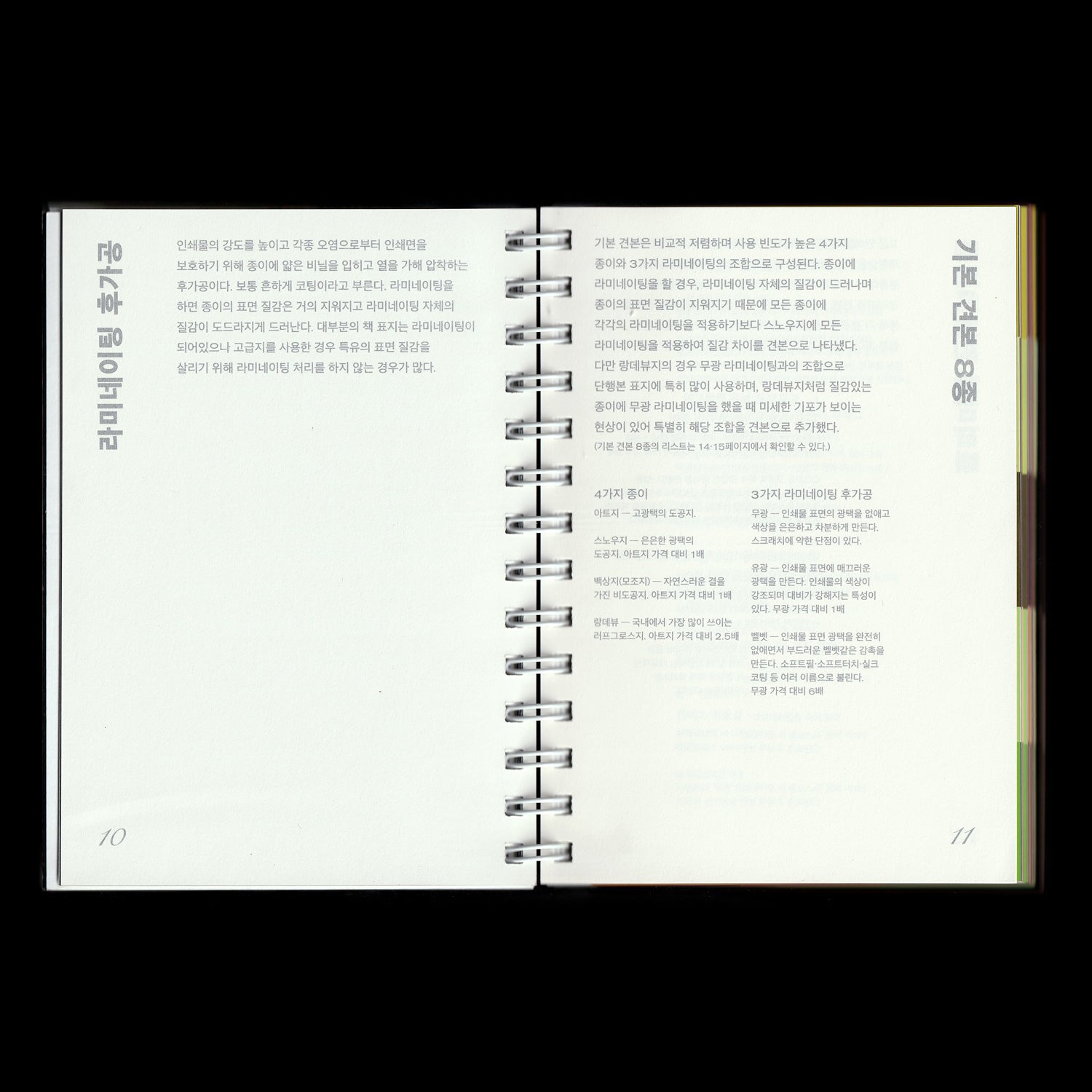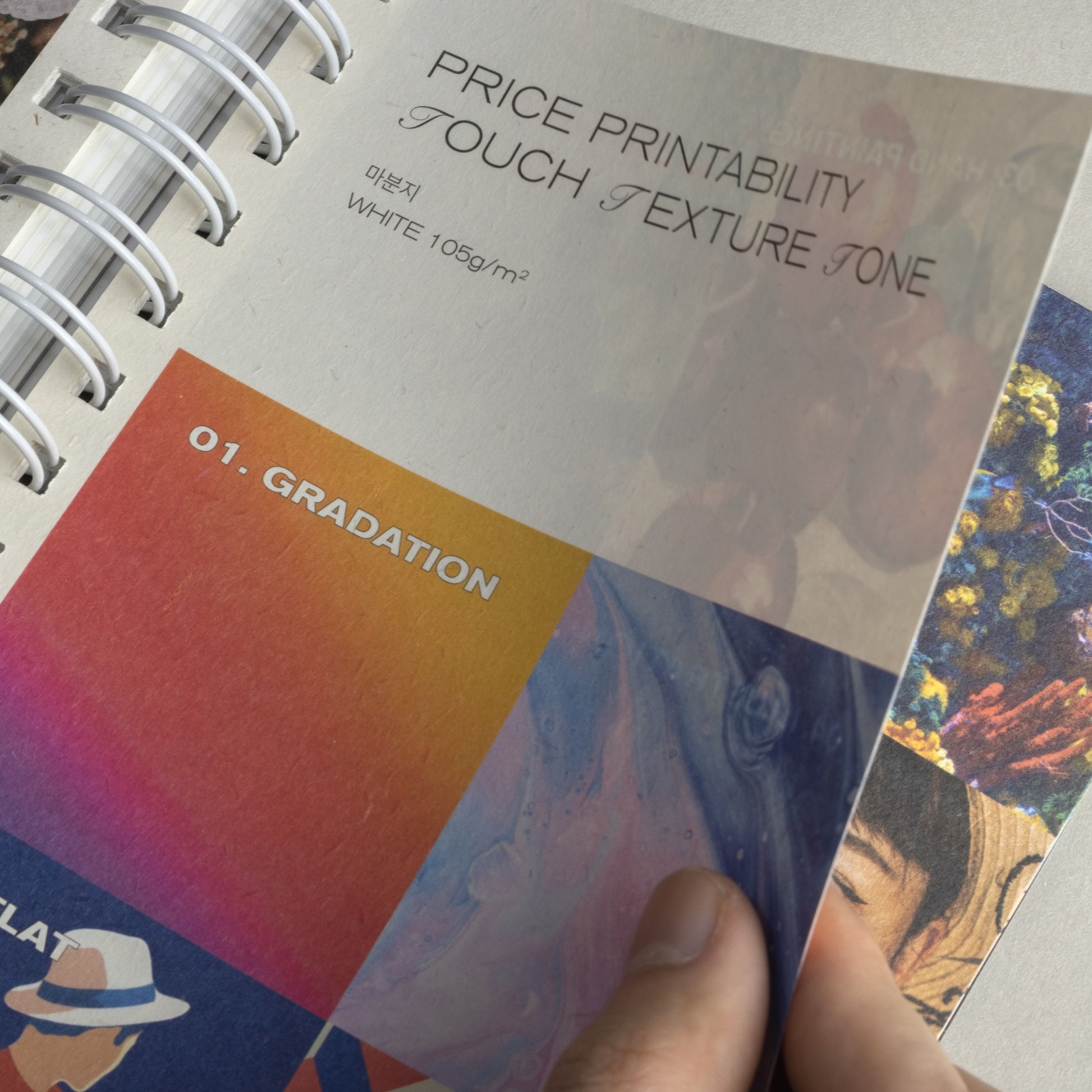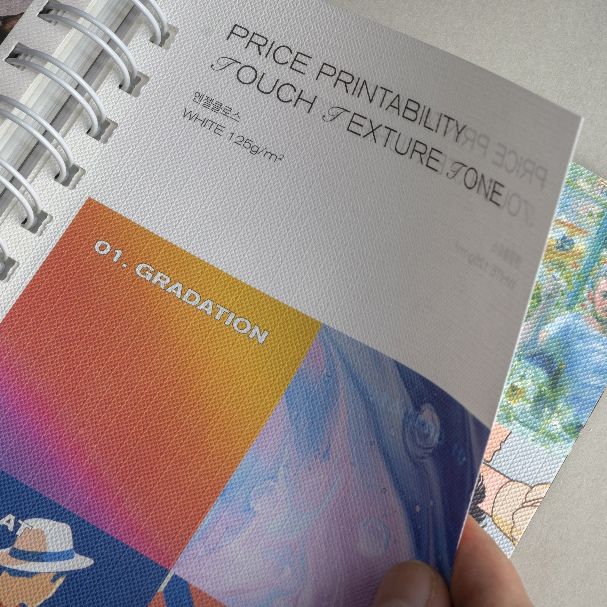 Face of Paper is a Korean paper texture sample book for comparing the color and texture of 8 standard and 10 premium papers. It classifies papers by printability, texture, and price, allowing users to intuitively check each sample’s characteristics and choose according to budget and purpose.