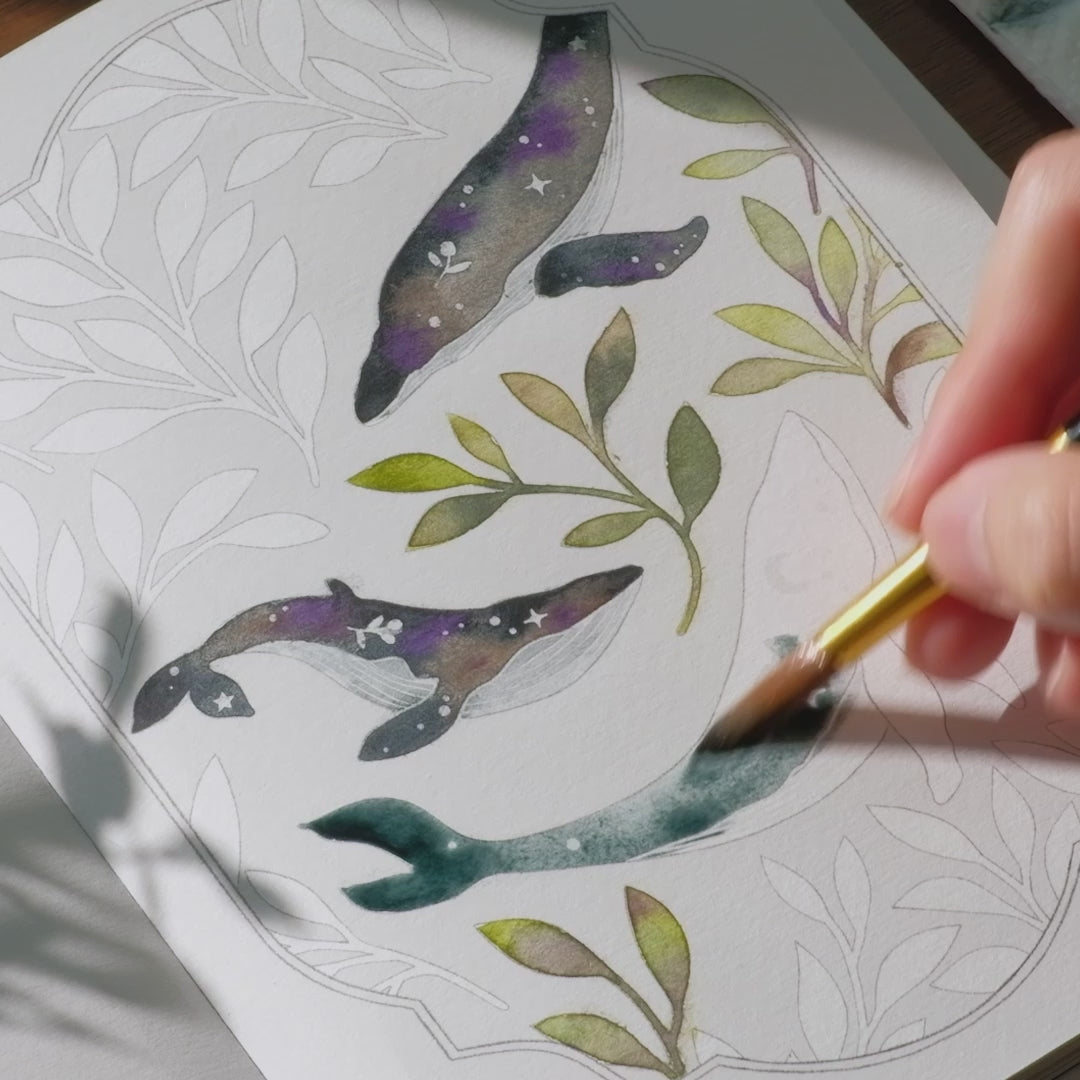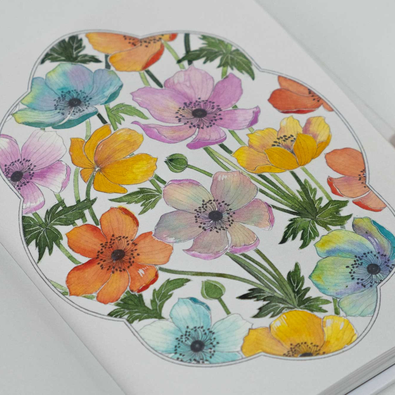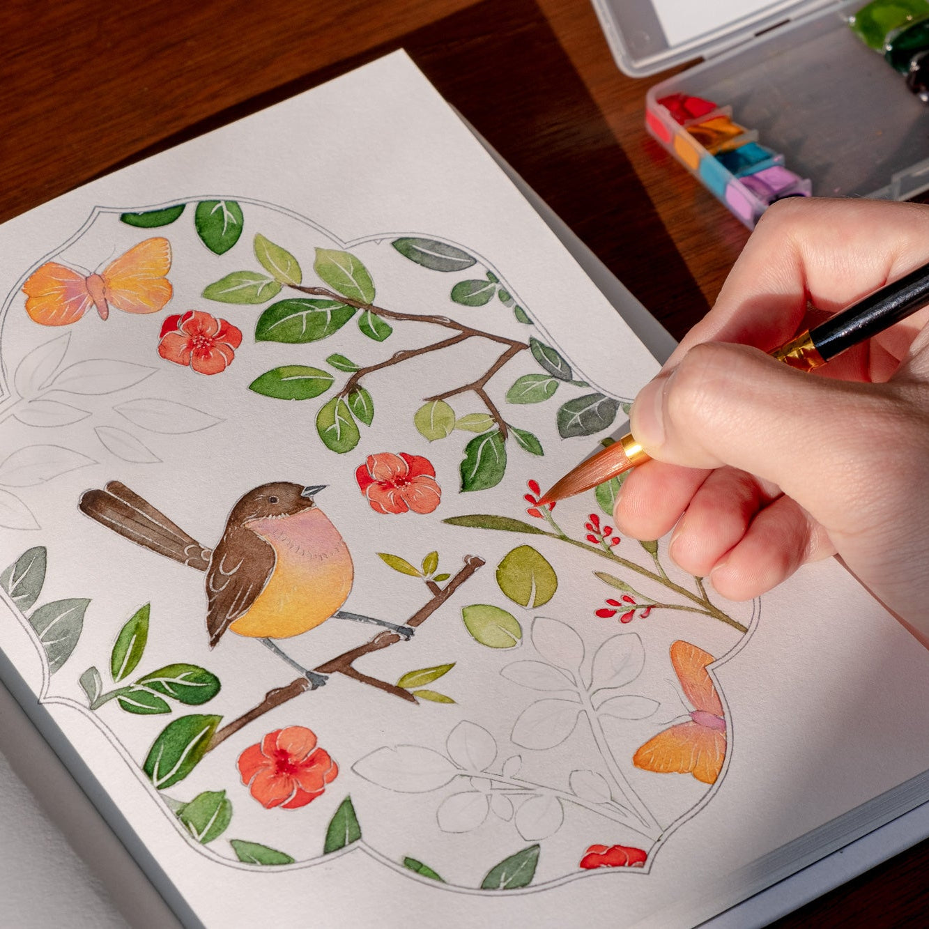 We’ve pre-selected 10 beautiful, well-balanced watercolor shades and hand-poured them into dry pans. The paints are Mission Gold Watercolors by Mijello, known for their vivid pigmentation and smooth blending. Though compact, each color contains enough paint to complete two full books. (Watercolors go a long way!)