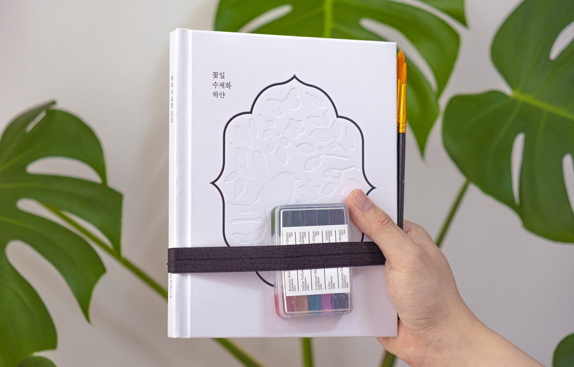 The book comes with a convenient elastic band—perfect for holding the brush and paint pans together for easy storage and transport.